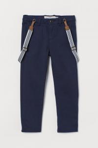 Trousers in a cotton weave with an adjustable, elasticated waist and zip fly and button. Side pockets, welt back pockets and tapered legs. Detachable, adjustable elastic braces.