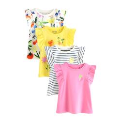 This 4-pack of vest tops are made from cotton and cotton-rich fabric blends for a comfortable and breathable feel, with adorable ruffle detailing to the sleeves, a crewneck collar and a mix of flower and fruit prints and 3D motifs.