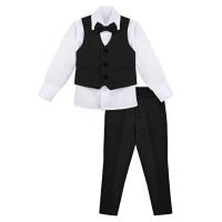 This is a classic black 3 button notch tuxedo with matching black vest and bow tie. This item includes 4 pieces: pants, shirt, vest and bow tie. The pants are hemmed at the bottom, contain a classic satin striped down the side of the pant leg and all sizes contain belt loops and elastic around the back half of the waist band. The shirt is white and contains a lay down collar with 1/8” pleats and black sewn on buttons The vest has 3 to 4 satin buttons down the front (depending on the size) . The bow tie that comes with this tuxedo is pre-tied, wraps around the neck and velcros together in the back.